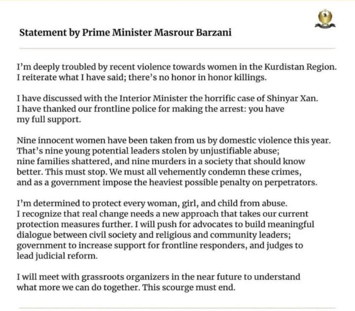 KRG Prime Minister Masrour Barzani said in a statement on Wednesday: “I’m deeply troubled by recent violence towards women in the Kurdistan Region. I reiterate what I have said; there’s no honour in honour killings.”